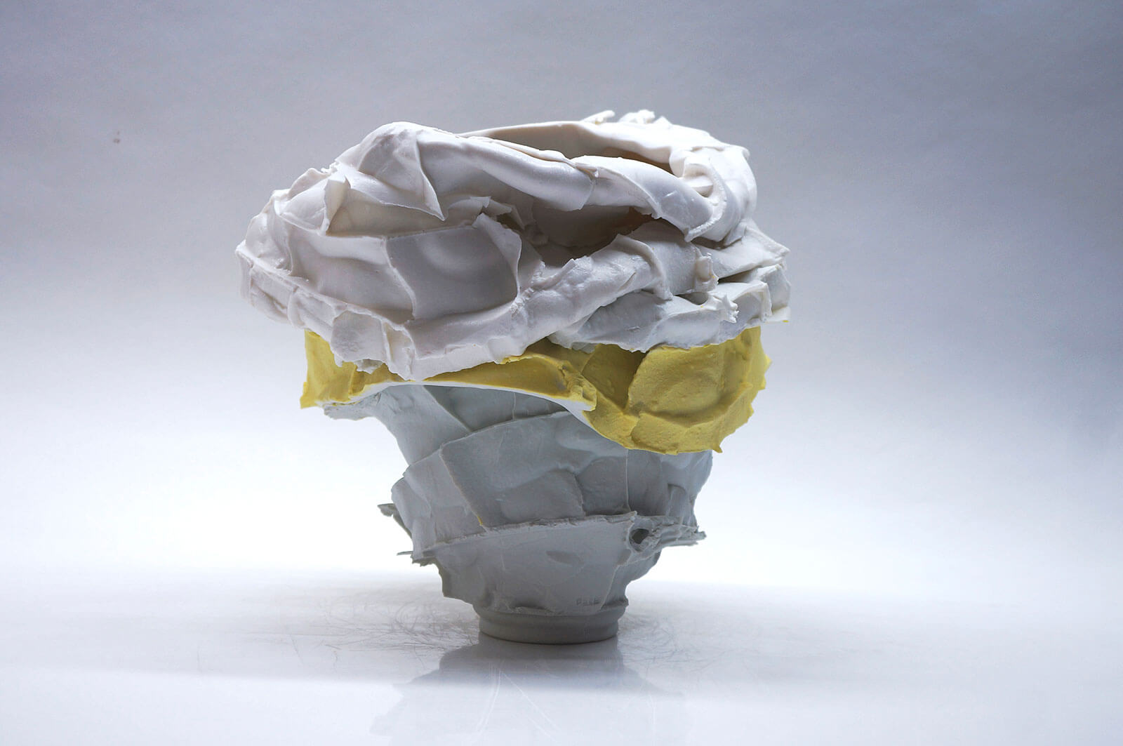 Chloe Lennon’s work exemplifies the role of Collect Open – to shed light on fascinating work by emerging artists which challenges our thinking and stretches traditional ways of making. An Irish ceramic artist with degrees in her discipline from NCAD Dublin and the RCA in London, Lennon interrogates our relationship with the materials she is trained to use. Rather than accepting the brilliance of gold, or the transformations of copper, she investigates where these materials come from and what it costs to deliver them – both in terms of environmental degradation and in human harm. What should the balance be between the creation of beauty and the consequential fragmenting of nature into landscapes to be exploited? While seeking to minimise her own environmental impact, her sculptures and objects dramatise this disequilibrium through their emphatic surfaces and evocations of the violence that is part of their complex beauty.