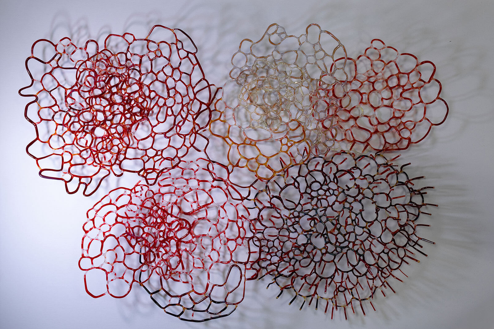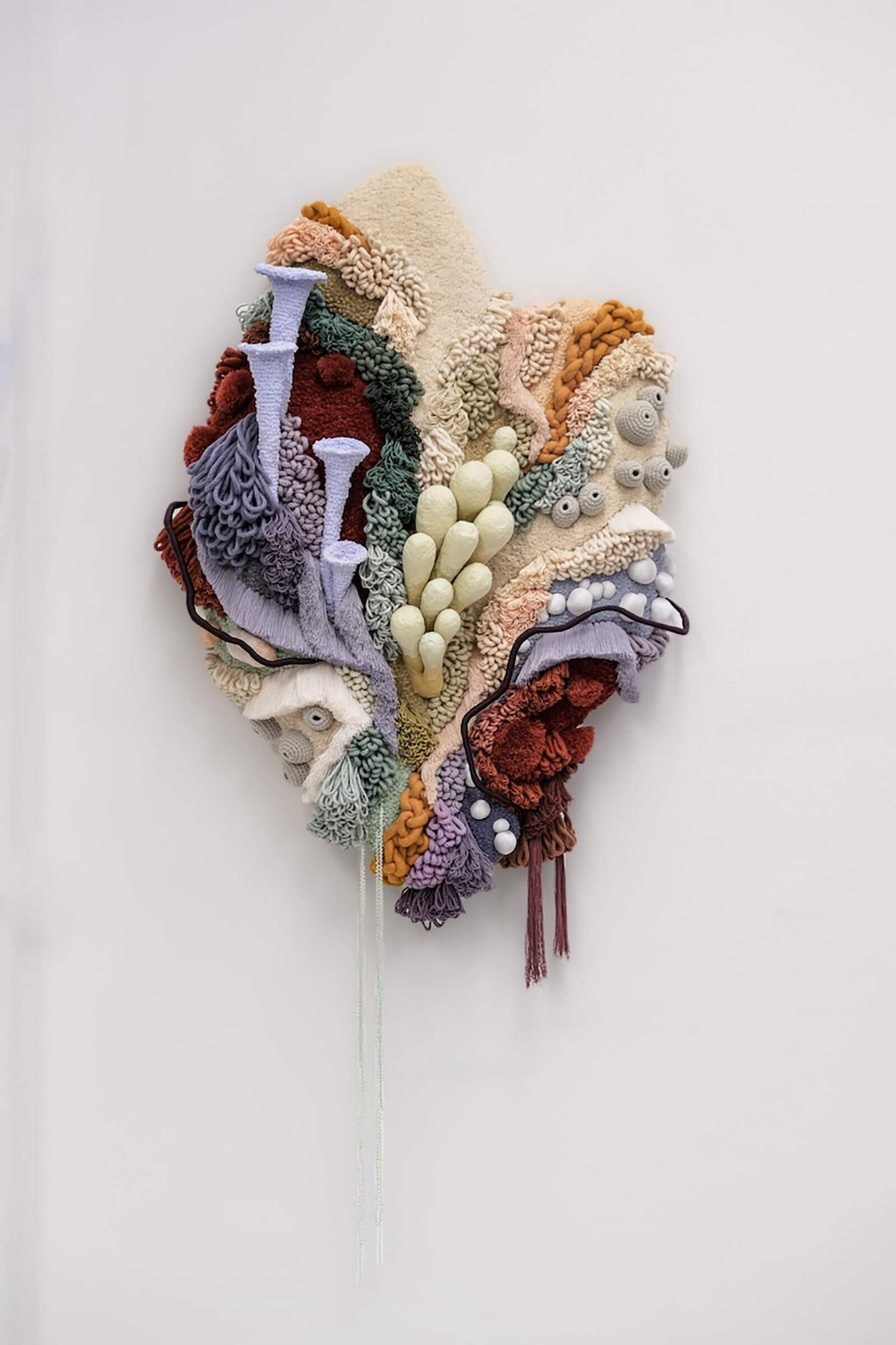 Ben Austin gallery, an independent curatorial platform for emerging and international artists, is offering a solo presentation of works by Portuguese artist Vanessa Barragão. In keeping with the ambition of other contemporary textile artists, Barragão uses her pieces, constructed from recycled dead yarn stock, both to summon the mystery and majesty of the sea and to create awareness of our fragile environment and ecosystem. Barragão honed her artisanal skills working as a designer in a rug factory in Porto, but her exquisitely crafted 3D suspended artworks, rugs and wall hangings are created using a whole variety of textile techniques, from latch hook, crochet and felting, to weaving and fibre manipulation. While rooted in her love of the natural environment, there is a surreal otherworldliness to her pieces – they seem to breathe with their own distinct vitality.