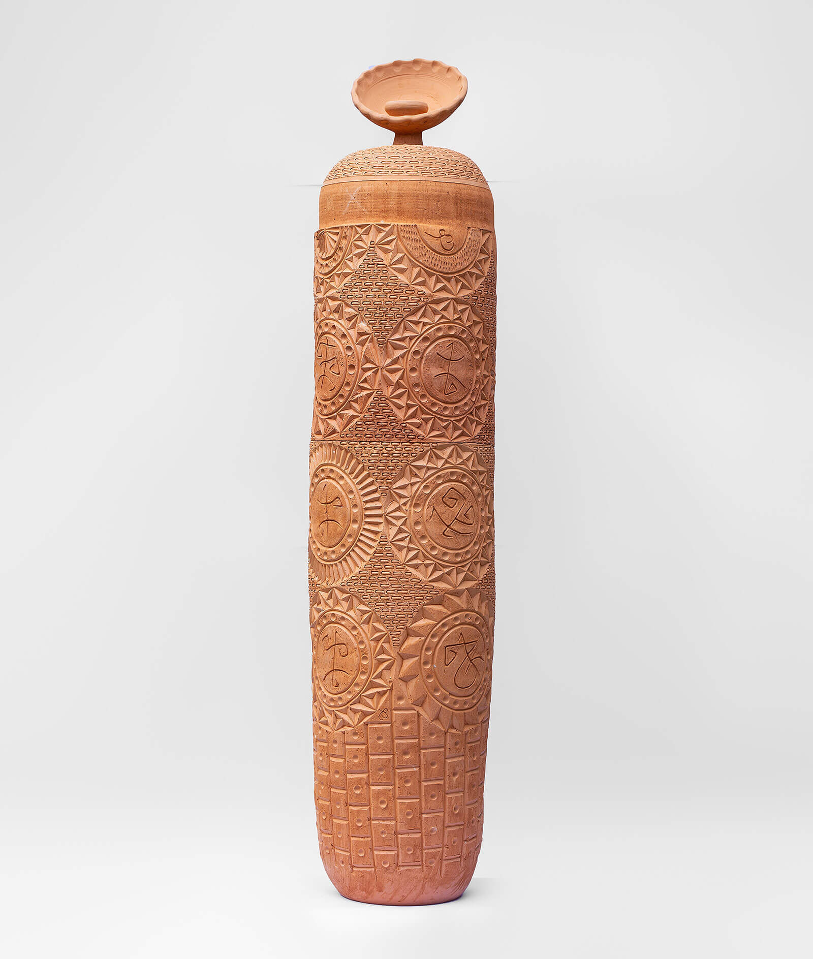 For Adusah, clay is not an inert material but one alive with ancestral memory. The heads of ancestor figures sprout from his monumental vases and the sides are inscribed with delicately carved symbols. Meanwhile, his smaller vessels – echoing the forms of ancient Greek vases – are lovingly carved as if with stitches, reflecting Adusah’s mother’s skill as a seamstress. They bear tactile handles of twisted clay, with cracks in their surfaces to reflect the fragility of life and memory.